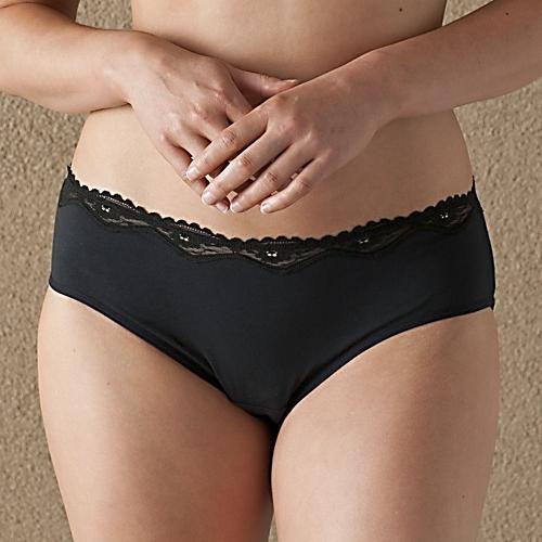 Our newest Organic Cotton Hipster Panties are made from silky-soft organic cotton blended with just enough spandex for a comfortable, yet flattering fit. Each is designed with a delicate lace embellishment at waistband. Hipster panties hit about 2" below belly button, with higher cut leg openings. 92% organic cotton/8% spandex. Machine wash. Made with low eco-impact dyes. Black, lavender or natural. Sold in 3-packs (same cut and color).